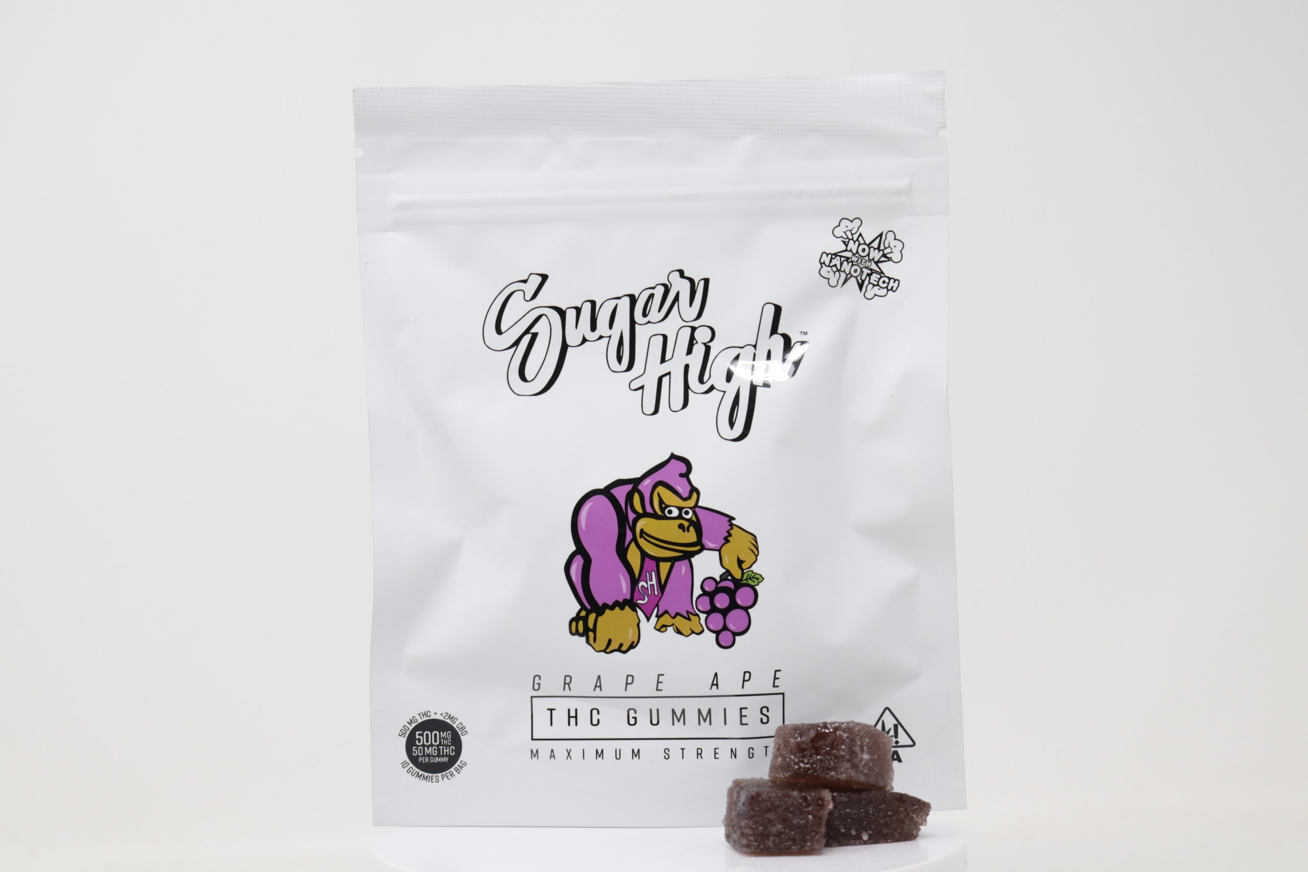 Relax deeply with Sugar High Grape Ape Gummies, infused with 50mg of THC per piece. Each pack contains 10 gummies for a total of 500mg THC, designed for powerful indica effects and long-lasting calm.